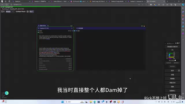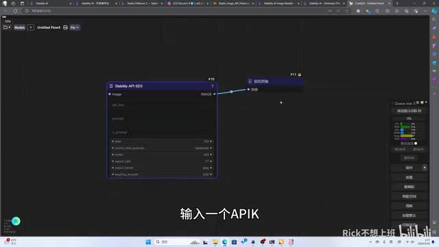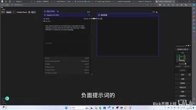 双击输入s d三,找到这个stability a p i s d三的这个组件,然后给它创建出来。这个组件我们需要关注的就是三个输入,一个a p i k,一个正向提示词和一个反向提示词。a p i k就是开发者手册当中提供的那个,可以把它复制过来粘贴到这个当中。正向提示词的话,你可以随便去找一个,或者自己尝试手动输入一个。