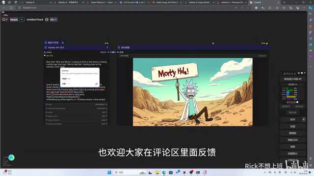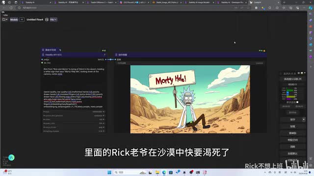 大家可以看一下,我这里画了一些几个颜色,瓶子和那个数字。虽然说瓶子的颜色和数字的排列有一些不同,但是基本上百分之六十以上吧都可以做到完全理解。后面我还尝试让他去画一下rick mode里面的rick姥爷在沙漠中快要渴死了,手上拿着一个白色牌子,上面写着mod help me的字样。然后他也是可以把整个场景的画面画风清晰的给他表现出来,特别是这个瑞克的细节,人物的还原程度是非常高的。