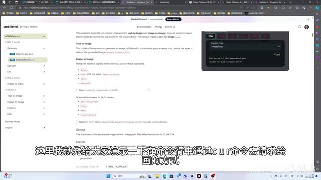 有一个插件呢也是在第一时间就去适配了官网的a p i请求方式,然后也提供了s d三的一个绘画组件。这里我就先给大家演示一下,在命令行中通过c u r命令去请求绘画的方式。然后再给大家演示通过conf u i来使用stability fusion三命令行。这种方式不需要你本地装了c m p u i,然后你是windows或者linux都可以使用这个命令。