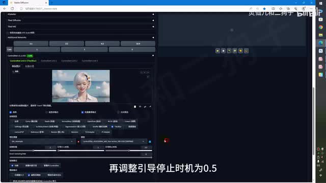 同样来到图形图,放入调色图像,输入提示词,一个闭眼微笑的白发女孩,选择提示词模板,调整采样器迭代步数稍微幅度调整为一,打开tile的飞行。选择放大算法,调整放大倍数,再打开control,let输入我们需要拯救的图像。当两张图像颜色差异较大的时候,我们可以适当调整引导停止时机,通过多次拯救的方式来达到我们需要的扩散图像。