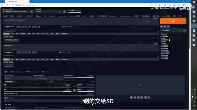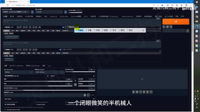 我们只只需要在开始时的时候控制图像人物的轮廓,打开第二个control t open force。然后让他全程引导人物的姿势,最后调整宽高,调整采样器,选择对应的大模型,再输入我们需要扩散的提示词,一个闭眼微笑的半机械人,白发半机械人、机甲室内研究所设备、电影剧照调整一下,选中选择对应的提示词模板。如果你觉得三个c t r l e t压力太大,可以选择打开tile的飞和和tile v一再点击生成。