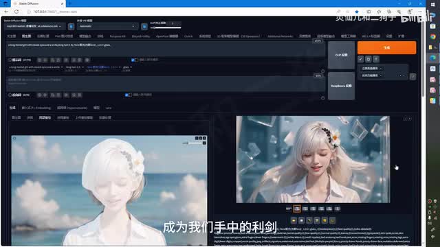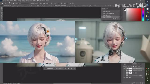 调整为六十,选择叉l的大模型,仍然输入我们需要扩散的主体,一个闭眼微笑的白发女孩,剩的交给s d。扩散出来的图像构图不错,但是细节和颜色都有问题。看来叉l的tile用着还不是很丝滑。