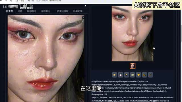 这里我生成这张图只用了几秒钟的时间,如果生成过慢,那记得去备注白小尺寸,这样子就搞定了。一共不到四十秒,给大家看一下局部细节对比图,无论是妆容还是皮肤细腻度都得到了优化,变化还是十分明显的。