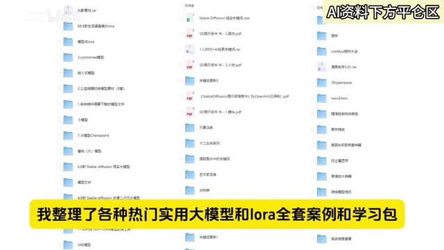 今天的分享就到这里了,为了减少大家找安装包模型和插件的时间。我整理了各种热门实用大模型和波尔全套案例和学习包,以及参数和咒语学习包等等。