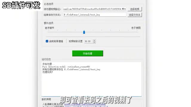 视频帧率如果太高的话也会增加处理时间,三十天就差不多了。都设置好了之后,点击开始处理就ok了。稍等片刻即可处理完成。打开输出目录即可查看去码之后的视频,然后打开a i换脸的软件,先把需要替换的人脸图片和视频上传上去,记得一定不要使用中文路径和名称。否则会这么说。
