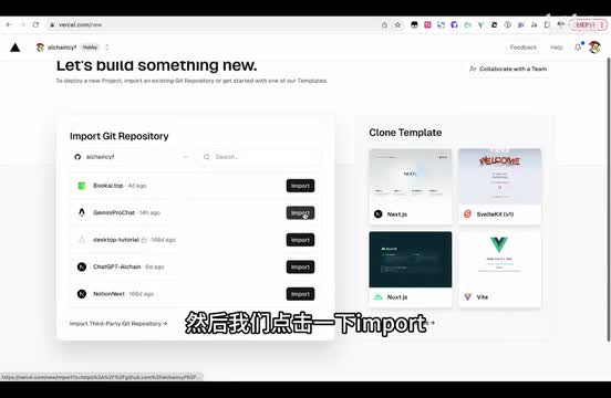 如果你第一次复制的话,它会让你做一些确认。复制完以后的话,你就有一个自己的这个项目地址,以及你自己仓库中的这个项目。然后有了这个之后,接下来一步比较关键,就是你需要有一个vessel的那个账号。这是一个非常好的和github b打的非常好的一个无服务器的一个托管平台。