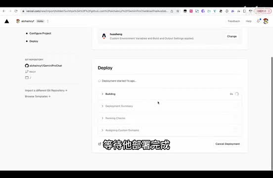 然后复制到这里,我们新增一下,然后点部署。点击部署之后大概要等一分钟左右的时间,等待它部署完成。ok现在其实就已经成功了。然后我们点at domain到下一个界面,然后这里其实已你已经有一个这个链接的。