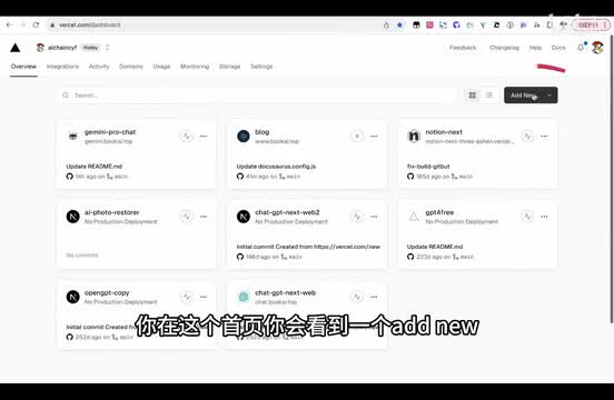这里也会把这个链接放到。我的视频的简介区。然后你注册完成以后的话,你在这个首页你会看到一个add new project的一个入口。这里已经关联了我github的账号。