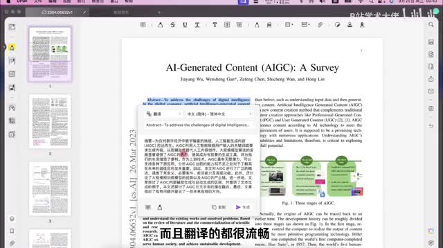 我们选中这一段文字,然后右键呢就可以出来这样一个翻译的按钮,就可以一键的去翻译出来这段文章的一个主要内容。可以看到它把摘要翻译出来了,而且翻译的都很流畅。文章的这些主要内容也都完全的给解释出来。然后这个时候我们就可以点击添加附注。我们点开这个小按钮的时候,我们这个翻译就可以直接的去展示出来。