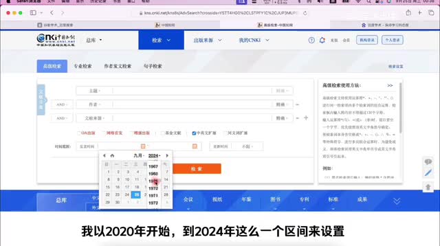 我们在搜索文献的时候,要用这个知网的高级搜索这样的功能。然后在时间范围这里可以选择近五年或者近三年的时间。我以二零二零年开始到二零二四年这么一个区间来设置。然后在主题这里输入我们想研究的这个领域的一些关键词。就可以看到这里都是一些关于a i g c的研究现状的一些文献。