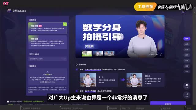 如果你想深度定制一个数字人,以前往往需要求助一些企业级的商业产品,他们的成本费用也会更高。但在上半年,b站为站内up主提供了一个a i数字分身创作工具必剪studio。只需要上传一定量的实景或绿幕拍摄片段和音频素材,就可以做出一个高质量的数字分身来了。对广大up主来说也算是一个非常好的消息了。以上就是这期视频里分享的所有内容了,看完以后你对a i视频这个领域有没有更熟悉一点呢?归功于在这个领域不断耕耘的a i科技公司和积极探索的爱好者们,a i视频的创作生态正在百花齐放。我们今天提及的也并不是ai视频制作的全部,还有很多有创意有深度的a i视频玩法,可能需要一点点额外的小操作。