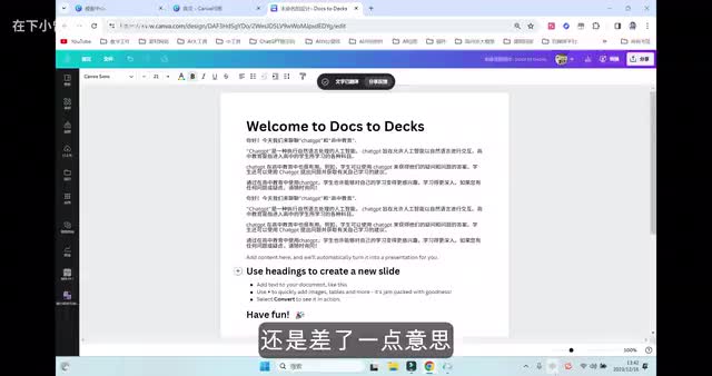 如果要用的话,点击这个地方的确定就可以了。那接下来呢我为大家演示一下如何在cover里面快速制作p p t。我们回到这个地方的首页,然后点击开始撰写,选择这个地方的文档转演示文稿。那点击进来之后呢,它的这个编辑界面其实就类似于word,我们非常的熟悉。然后可以点击这个地方的一个加号图标,打开之后呢,我们会看到有一个魔法文案工具。