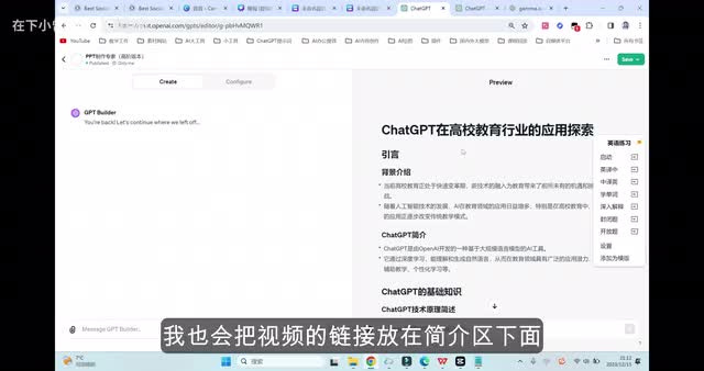 那这个东西其实就是类似于我们的一个a i撰写文章的一个功能。我们可以给定它一个主题,让他帮忙撰写文章的内容。但是呢我尝试了一下,目前来讲不是特别的智能,和g p t四相比的话还是差了一点意思。那这个地方我还是通过我的这款高级p p t写作助手,我们来到chat g p t,我让他已经帮我拟好了大纲,以及撰写了详细的这个正文内容。主题是关于char的g p t在高校教育行业的应用探索。