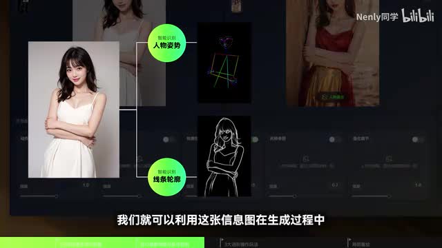 在这里你可以看到三种基于形体识别的控制方式,有两种风格和增强性的控制。我们上传上来的每一张照片,默认就会在动作与轮廓这两种控制方法下展开生成。它的重要逻辑是通过一些人工智能算法识别上传图片中的相应特征,并生成一张信息图。随后我们就可以利用这张信息图,在生成过程中引导a i保留这部分对应的特征元素。也因此我们就可以通过这两项控制,保持人物的姿势与大致的身体俯视轮廓不变。你可以在上面控制每一种功能的开关,然后把图片拖拽到下面区域里,输入下方强度就代表施加的控制效果强弱。