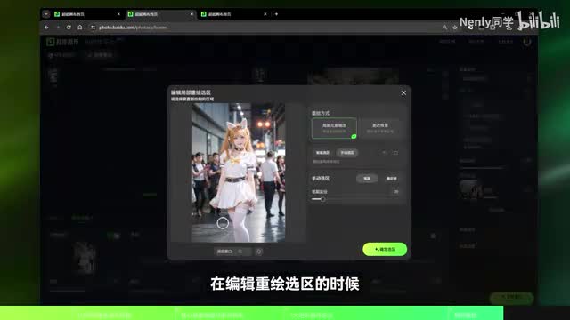 但如果是去添加一些原来没有的东西,最好像刚才一样,尽可能拉大到零点八到一点零之间。这种局部重绘的技巧很有用,在各种需要对照片做后期编辑的场景里都可以派上用场,同样动动嘴就能把图修好。另外,它还能在我们其他的一些操作流程里提供非常大的帮助。比如我们刚刚尝试过的换背景。在编辑重回选区的时候,有一个选中背景的快捷选项,选中它的时候,它会智能识别出人物以外的背景部分,再按照和刚刚类似的方式导入景深控制图,调配灵感配方,就可以更方便快捷的实现背景的更换了。和刚刚有所区别的是因为我们使用的是局部重绘,所以可以做到完整保留人物本身的特征,做到只改背景不改人物。