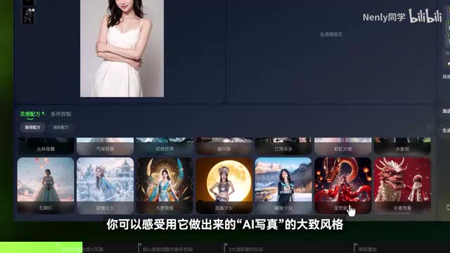 第二步调制配方。有了照片以后,我们就要为它挑选一个灵感配方来开启下一步的创作。下面的灵感配方区域会为你准备好海量的富有特色的推荐配方。从名字的预览,图片的形象,你可以感受用它做出来的a i写真的大致风格。我们单击选中其中的一个,此时右侧的一系列参数都会被自动设置好。前两步完成后,就可以在右下角点击立即生成,静待这个a i摄影作品出炉了。