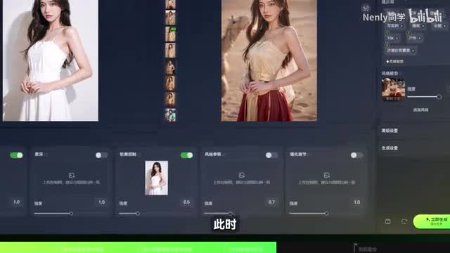 改变比例时,人物识别出来的姿势不会变,位置维持在画面中央。而在照片本身就带有一定的场景元素时,也可以考虑开启景深识别,并结合不同的灵感配方,让背景焕然一新。哪怕是一些在现实中无法搭建出来的场景,利用这样的方式都可以实现,很神奇对吧?玩法二,细节修复。在你通过生成得到了一张大致满意的照片以后,还可以在保持画面内容不变的基础上再进一步细化。此时你需要在最右边这个强化细节的控制选项打开,在这里把你上一次生成的成品图导入进去,然后同样适当降低强度到零点八,并保持原来的姿势和轮廓控制不变,再点击生成,它就会在维持你的画面风格与内容都不变的情况下进一步细化作品。以这张图片的细化结果为例,衣服褶皱、人物身上的配饰乃至场景细节的地方都得到了丰富,整体观感更加精致细腻。