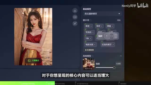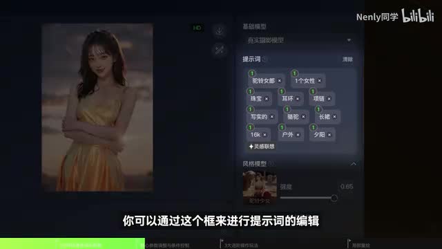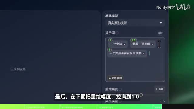 我们生成的这张摄影作品的具体内容主要有两大块,区域控制。第一个区域是右边竖着的这一列参数,这里面最核心的应该就是这个提示词了。提示词是我们指挥ai生成画面内容最直接的方式,在右侧参数区域里,你可以通过这个框来进行提示词的编辑。当你选中一个灵感配方的时候,这里也会为你预先填入一系列的描述成分。你可以在下面再按照你的想象添加,用中文或英文输入都可以。每说完一个词敲一下回车就可以把它添加上去。