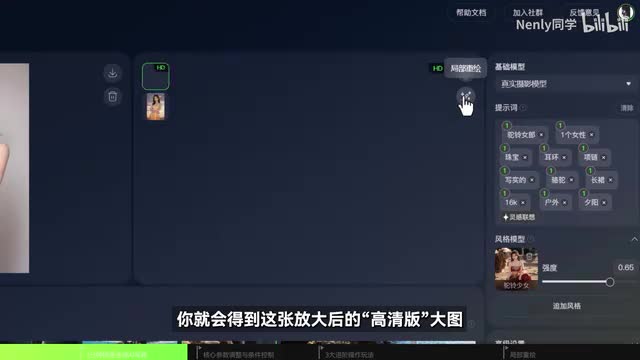 你觉得这张a i摄影作品的效果如何呢?可以把你的评价打在公屏上,这张生成的照片初始尺寸比较小,放大了看可能会显得有些模糊。不过我们可以点一下照片右上角这个h d小按钮,把它放大一下。再等一会儿你就会得到这张放大后的高清版大图。此时点右上角的下载按钮,就可以把它保存到你的电脑上了。当然这只是一个最基本的操作。如果你想要取得更加精细的效果,就必须得进一步深入了解超能化玻璃的各项功能了。