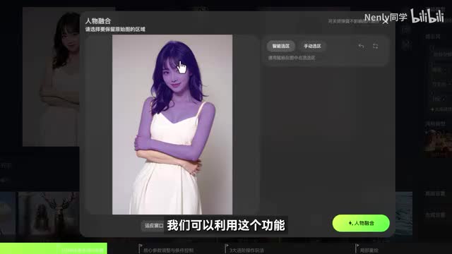 大约一分钟不到,右侧的成品区域就会将生成的作品显示出来。看这张照片的场景风格变得完全不同了,人物的服装配饰也根据我们选择的配方做了对应的调整。不过ai生成有一定的随机性,可能生成的面部、手部会有一些瑕疵,这个时候你可以通过接下来的第三步对照片做一些精修第三步,人物融合点一下成品区域上方的人物融合小按钮,会跳出一个操作窗口,在这里把鼠标移动到人物身上,它会智能识别出对应区域,点一下就可以锁定选区,我们可以利用这个功能将人物的面部、头部等关键区域选出来,自己选中的区域会被融合进我们刚刚生成出来的图片里,从而让作品和原片更像。如果生成图片的首部发型的位置和原图有出入,也可以选择这个地方,让ai按照原图修改这些部分。如果觉得这个智能识别不好锁定,也可以切换到手动模式,通过手图决定融合的区域,画错了可以随时通过上面两个小按钮撤销或者重置。处理完了以后,再点右下角融合按钮,等待二次生成完毕,一张生动传承的a i摄影作品就大功告成了。