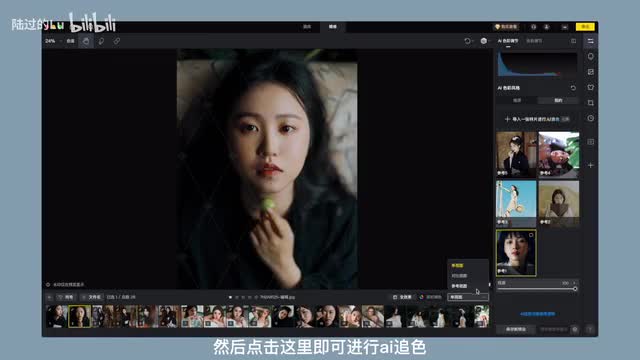 我们在使用时可以在这里导入你的参考例图,然后点击这里进行a i追色。如果觉得效果过强,还可以在这里改变到合适的强度。