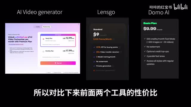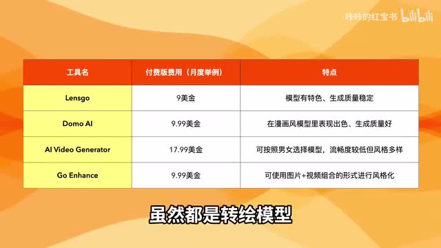 我觉得这个工具的转会效果可能不算是最好的,但是前面那个图片加视频组合生成的玩法还是蛮值得尝试的。总结对比,我们再来回顾一下今天介绍的四大转会工具,let's go多个a i a i video generator,going hands, 每个都有自己的优势和特色。虽然都是转会模型,但是细微之处还是有差别的,并且订阅付费价格也不尽相同,大家如果想使用的话,可以按照今天的教程挑选合适的工具免费试用一下,再决定要不要付费。查看个人的话还是觉得多么a i比较好用一些,其他的播放器的费用和测评对比也就附在下面了。