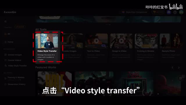 第一个工具lens go let s go是一个ai生成图像与视频的工具。点击首页就可以看到它支持多种不同的a i功能,比如纹身、图纹身视频、图像视频等等,甚至还可以自己训练模型,而其中的王牌功能就是a i转会了,直接被排在了首页的第一个位置,我们就来尝试一下吧。点击video style transfer进入转会界面,点击左侧style就可以看到支持转会的所有风格,这也太丰富了吧,不仅有皮特斯、日漫、梵高等基础风格化效果,还有像jojo、乐高、复古三d毛绒风等等特色的效果。并且这里有一个apple image的按钮,还可以支持上传自己满意的图片作为自定义风格,让ai转会同风格的视频。