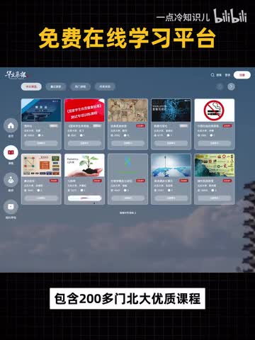 第二个,华文慕课,这是北大推出的一个免费在线学习平台,包含两百多门北大优质课程,涵盖计算机、文学、历史、医学等十三个学科。