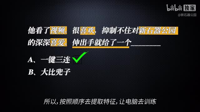 因为模型有点复杂,而之前机器翻译那一期已经介绍过了。我们就不展开说了,有想刨根问底的小伙伴可以去看那一期。简单来说就是让句子里的词自己去和句子中所有的词做向量相乘,乘出来的结果再去做训练。比如上面这句话中的视频,喜欢新石器公园等等词与正确答案一键三连的相关性更大。那么如果向量正确的话,这几个词与一键三连乘出来的结果应该更大。电脑不知道啊,所以他一开始只能随便给向量,这样它乘出来的结果可能也就很随便,怎么办呢?大鼻兜子伺候。于是最终在这种训练下,电脑自己就能找出句子接龙中如果要猜出正确的词,哪些词的权重更高,这就和我们对这个句子结构的理解非常接近了。有了transformer自注意力机制的加持,我们终于可以成功的对语言进行压缩和特征提取了。