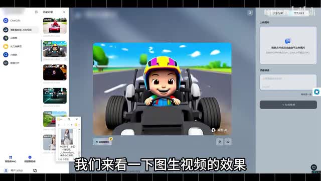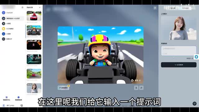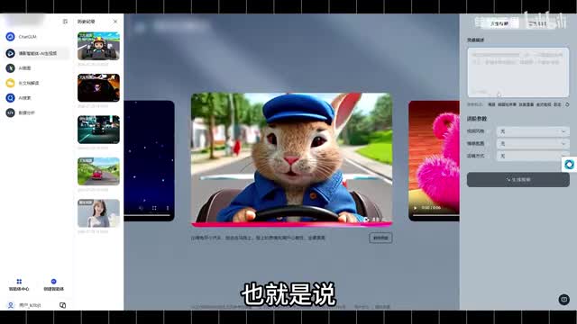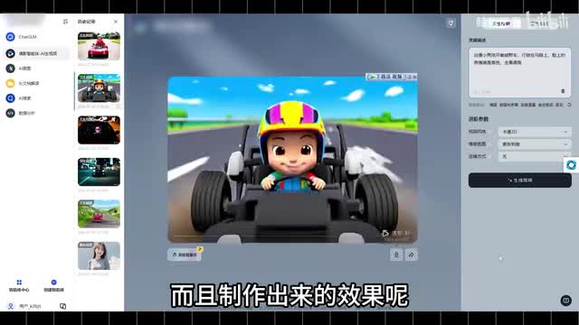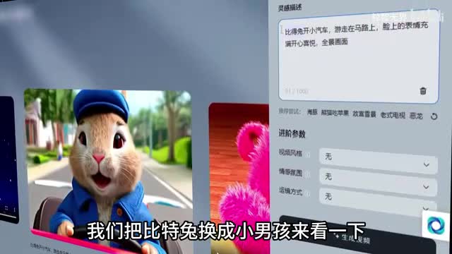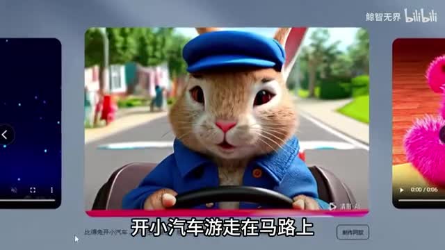 就比如一面做的这个视频,它的提示词是彼得兔开小汽车游走在马路上,脸上的表情充满开心喜悦。
