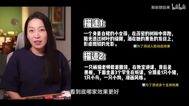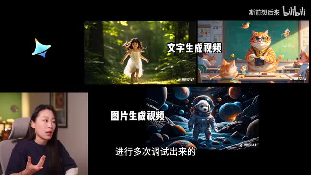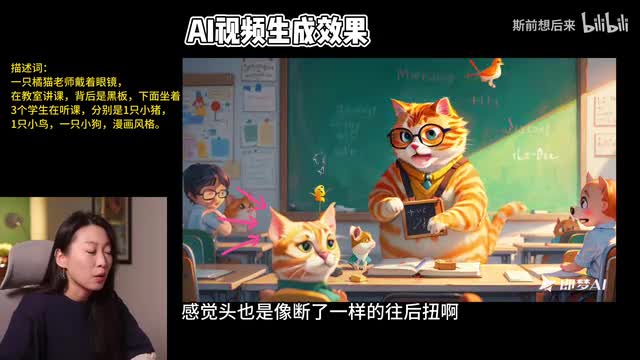 我们看一下第二段描述这个橘猫的效果还可以啊,就老师的这个效果还可以,但是底下的这个学生基本上和我描述不太一样,上面还有一只鸟正在。走然后底下有一个小猫,感觉头也是像断了一样的往后扭啊,就很吓人。这还有一坨,我不知道什么东西,效果不是很理想。让我们来学一下大家做的比较好的视频吧。我发现基本上都是先去做这个图片生成,然后再做视频生成。