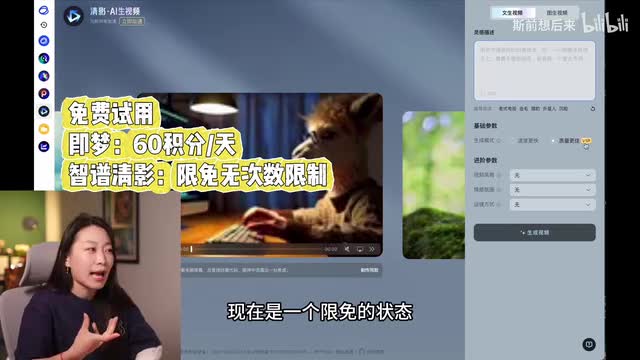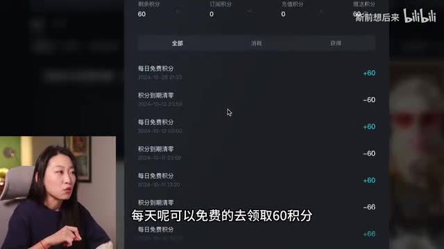 我们再来看一下这个图片生成视频的一个效果。啊,果然就好多了,所以a i这个工具还是有一些使用技巧的对吧?我们看到了很多比较精美的a i视频,都是通过更复杂的步骤进行多次调试出来的。所以我们看第一个a i工具,我们想要通过简单的文字生成视频,还并不能达到很理想的这样一个状态。我们来看一下它的收费,我用的是免费的积分额度。刚刚说了每天是六十个积分。