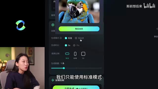 一点五我看了一下是需要会员的,所以我们用一点零。它这个参数设置啊对比前两个就比较丰富,多了一个创意想象力和相关度的调节。免费版本下面呢我们只能使用标准模式五秒视频,就跟他官网说的不太一样啊。它官网说可以生成两分钟的视频,也是可以选择运镜。而且增加了运镜调节,就可以手动去调节这个运镜方向。
