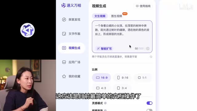 收费会员第一档的话是六十六个月,这个收费是介于集梦还有质朴之间的整体,给可怜i打一个分吧。第四个通义万相,这个操作就更简单了,只有输入和画幅比例,这应该是目前最简单的交互操作了。可以选择是否让a i去增加创意,增加背景音乐描述。可以扩写,但是感觉扩写了一堆氛围词汇没有啥用。生成时间要十分钟,这是目前最长的一个初始灵感呢,也是五十灵感值。
