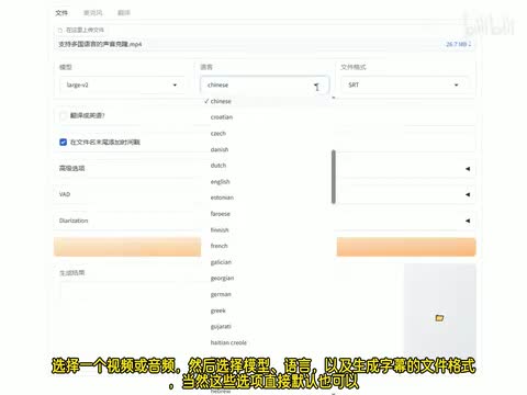 软件会自动打开这个本地网址,选择一个视频或音频,然后选择模型语言以及生成字幕的文件格式。当然这些选项直接默认,也可以选择是否需要将字幕翻译成英文,然后点击生成字幕,稍等一会儿就能完成。