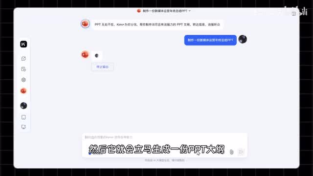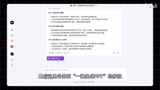 比如我想制作一份新媒体运营年终总结的p p t,然后它就会立马生成一份p p t大纲。大概需要一到两分钟。
