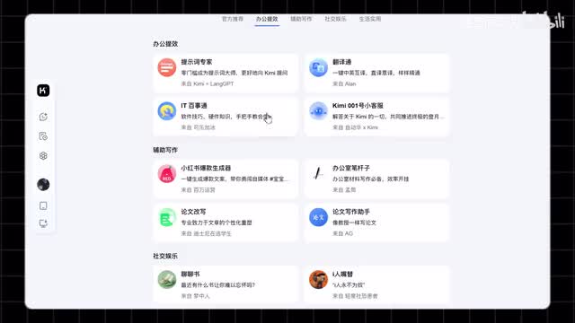比如官方推荐的这些长文生成器、爆款网文生成器、p p t助手等,还有办公提效、辅助写作、社交娱乐等等。其中我最喜欢的是p p t助手。