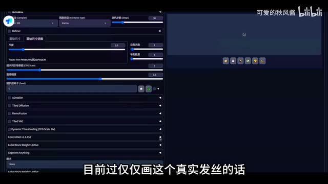 然后随机种子下边的都不用管,还有在下边这个control net,这个呃有时候很好用。但是呃目前仅仅画这个真实发丝的话,咱们用咱们刚才的方法是暂时不需要的。接下来都不用管它,回到上面点击生成,这个时候呢大概等待几十秒就ok了。