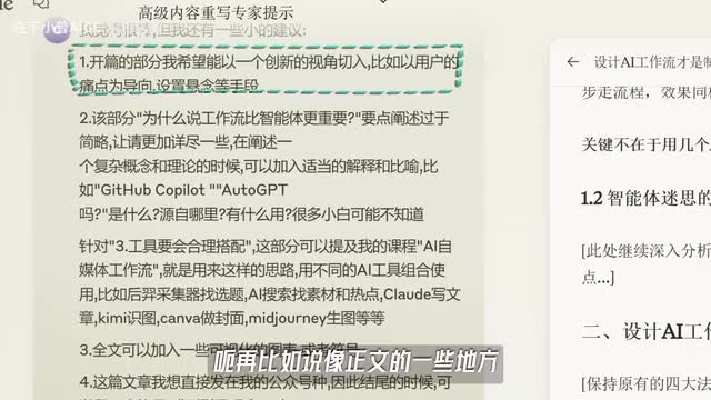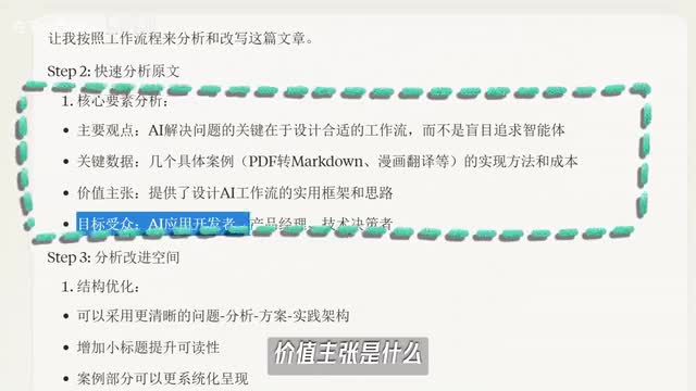 你干嘛?啊。ok第一步把这套提示词先发给a i那接下来他会提醒你上传你的原始内容。那我这儿呢就以这篇内容作为我们的一个实操案例,我点击发送给a i然后第二步大家可以看到它紧接着就开始分析这篇文章它的各方面要素了。比如主要的观点是什么?用了哪些关键的数据,价值主张是什么?目标受众是什么?啊,你看a i分析的很到位,这个地方核心观点主要就是讲a i应用的关键在于设计适合ai的工作流,而不是过度依赖ai智能体的这个概念很准确。第三步呢,a i它就会基于上面的这个分析提出改进空间,相当于就是在这一步找到不足的地方或者创新的点,以此作为二创文章的优化方向。