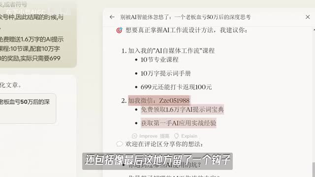 所以呢我这个地方就把我的一些基本信息发给他,我让他自由的去进行一个组合。所以你们会看到它给予我刚才所提到的这些建议啊,有可视化的图表。这个地方他还加入了我的一个课程的一个引入,还包括像最后这个地方留了一个钩子,还包括对我课程的一个推荐啊,我觉得融合的很好。那这个方法呢就比我们人工一条一条的去手写快太多了。当然这个地方我并不是提倡大家都去洗稿,而是说在ai工具的赋能之下,提升我们的创作效率。
