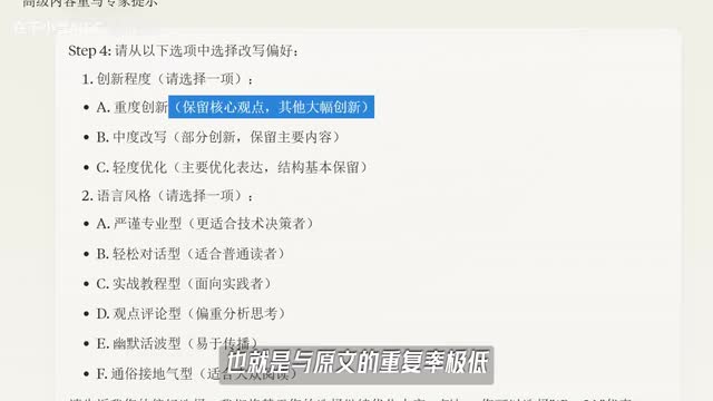 所以大家可以看到这地方结构方面、案例更新方面、观点补充以及表达提供方面,都给到一些很实在的一些建议。第四步,进行一个改写偏好的一个选择,主要是选两个东西。一个就是你想要创新的程度,另外一个就是语言风格动作创新。也就是跟原文的这个重复率极低啊,你就可以选a然后中度改写呢就是部分创新,轻度优化就基本的这个结构是保留的,主要就是优化一下语言表达方面,所以这个就看你的实际情况。原风格呢我这儿是选了一个通俗接地气。