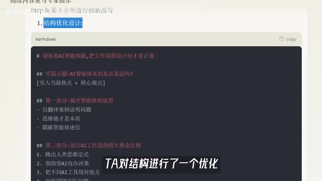当然除了这个之外,还可以去考虑一下a到e的这个选项。我这选的是b选项加f选项,我让他开始执行第五步,那第五步就会开始进行创新的改写。我们可以先看到它对结构进行了一个优化。也就是基于我们原始的那个内容,他做了一个大纲的一个改写。基于这个大纲让他一步一步的开始撰写正文的内容。