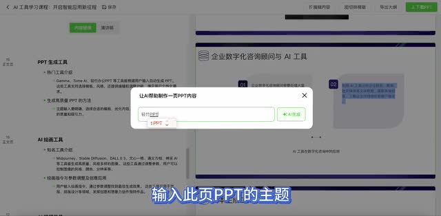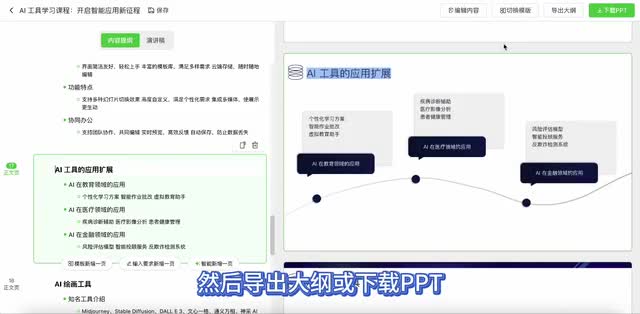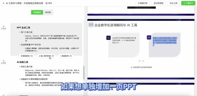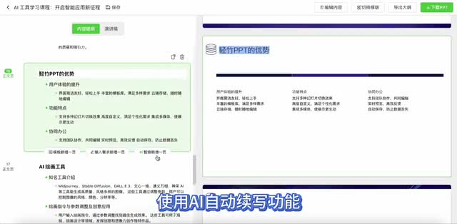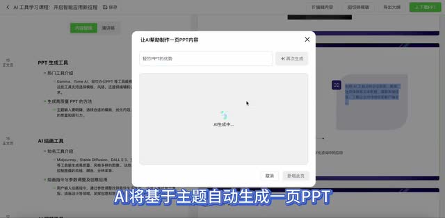 可以根据上下文自动生成一页p p t,然后导出大纲或下载p p t。