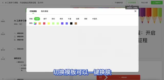 生成p p t大纲后可以编辑,点击生成p p t可以看到样式效果,切换模板可以一键换肤,青竹办公将自动排版,还可以使用青轴的ai助手功能。