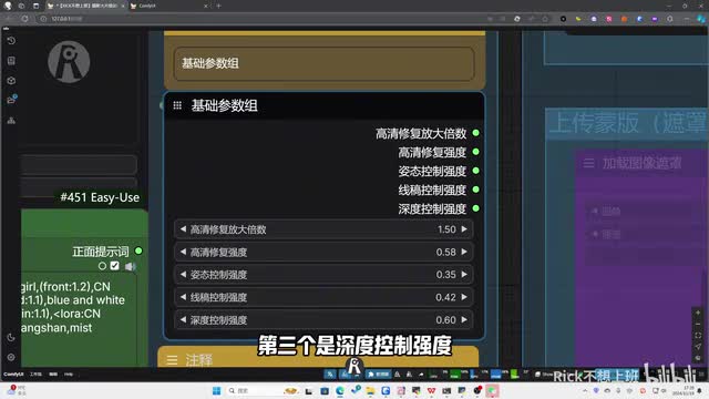 如果想要改变每一次出图的结果呢,那么我们可以通过手动的修改随机种来达到生成不同图像的效果。接着往下看是我们的基础参数组,基础参数组当中包含五个参数,主要是高清修复放大倍数、高清修复强度以及下方三个控图强度。第一个是姿态open post的控制强度,第二个是线稿控制强度,第三个是深度控制强度。那么经过实际测试,这三个构图控制的方案选择其中一个效果是最好的。在同时打开线稿和深度控制的情况下,会对我们的图像质量造成影响,使得最终出图效果下降。以下三个参数是控制权重。那么如果需要开启其中的某一种控制方案,可以来到控制器的选区当中。通过点选的方式,我们可以选择其中的某种控制方式。