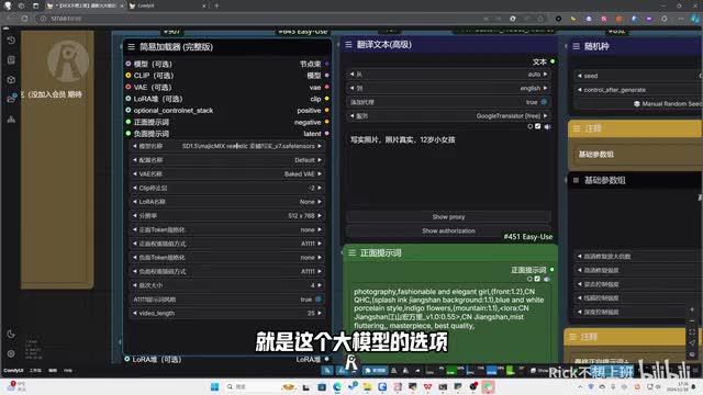我们来到提示词区域,在高级翻译文本提示词节点这里,我们可以去输入中文的提示词,那么它会自动对我们的中文提示词进行翻译,并且与我们下方的正向提示词进行串联。最终呈现出来的提示词,我们可以在这个展示框内查看。为什么我们会提供一个最终预览的正向提示词呢?一方面是查看我们这个翻译的内容准确性,另一方面最终正向提示词也会去和我们的风格反推提示词进行串联。所以为了方便,我们在这里提供了一个最终查看的节点的。那么如果有不符合预期的。这词也可以在这里复制,然后粘贴到正向提示词当中进行更改。下面这个红色的输入框是负面提示词,一般不需要去修改。再往右看是我们的随机出图种,默认它的变更模式是固定,也就是我们每一次出图的画面都是固定的。