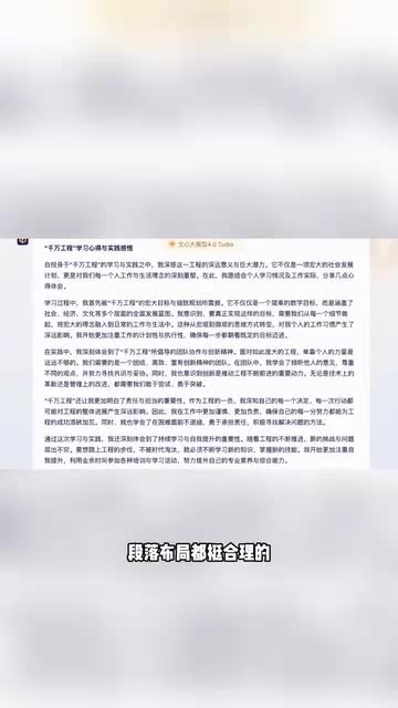 然后我们来看一下心得体会。首先,文心一言文章的结构较为清晰,段落布局都挺合理的,但缺乏具体的实力和引用相关的理论数据来增强文案的说服力。