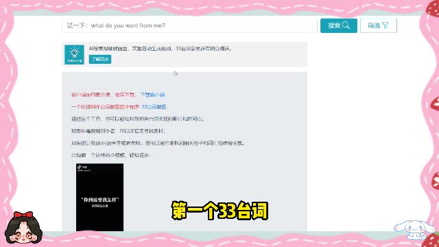 那我能够拿到这么多收益是因为我写文案很牛逼吗?那我可以告诉你,并不是,是因为我有大把文章的文案来源。这边也给大家分享一下。第一个33台词,直接输入你想要找的台词,就能够找到所有相关的电影,包含该台词在电影里面出现的时间,同时可以筛选影片的语言和类型,做影单或影视解说后必备。