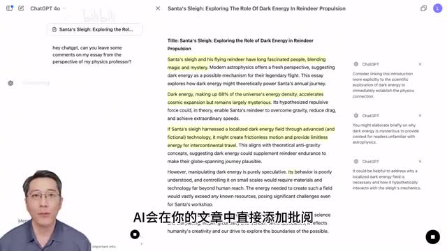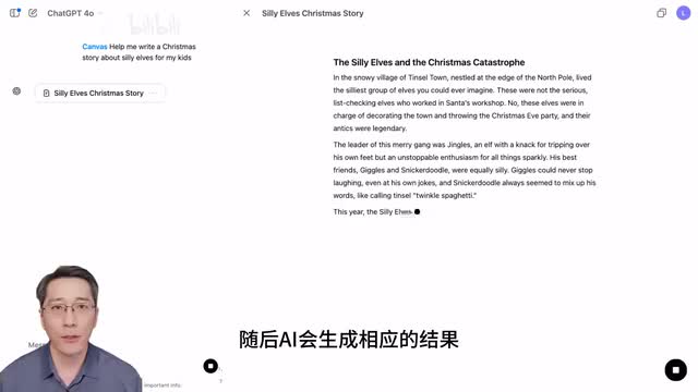 画布允许用户和a i一同编辑创作,而不仅仅是问答反馈。比如在画布中添加提示词,写一个关于精灵的圣诞故事,随后a i会生成相应的结果。接下来你可以直接在生成的内容中进行编辑,就像编辑一个普通文档一样,这相当于你和a i共同创作。
