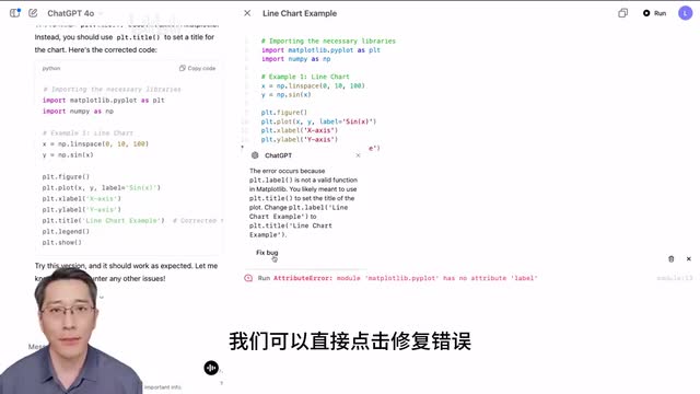 而且运行代码出现了错误,a i也会给出意见。我们可以直接点击修复错误。a i就会自动帮我改正代码。